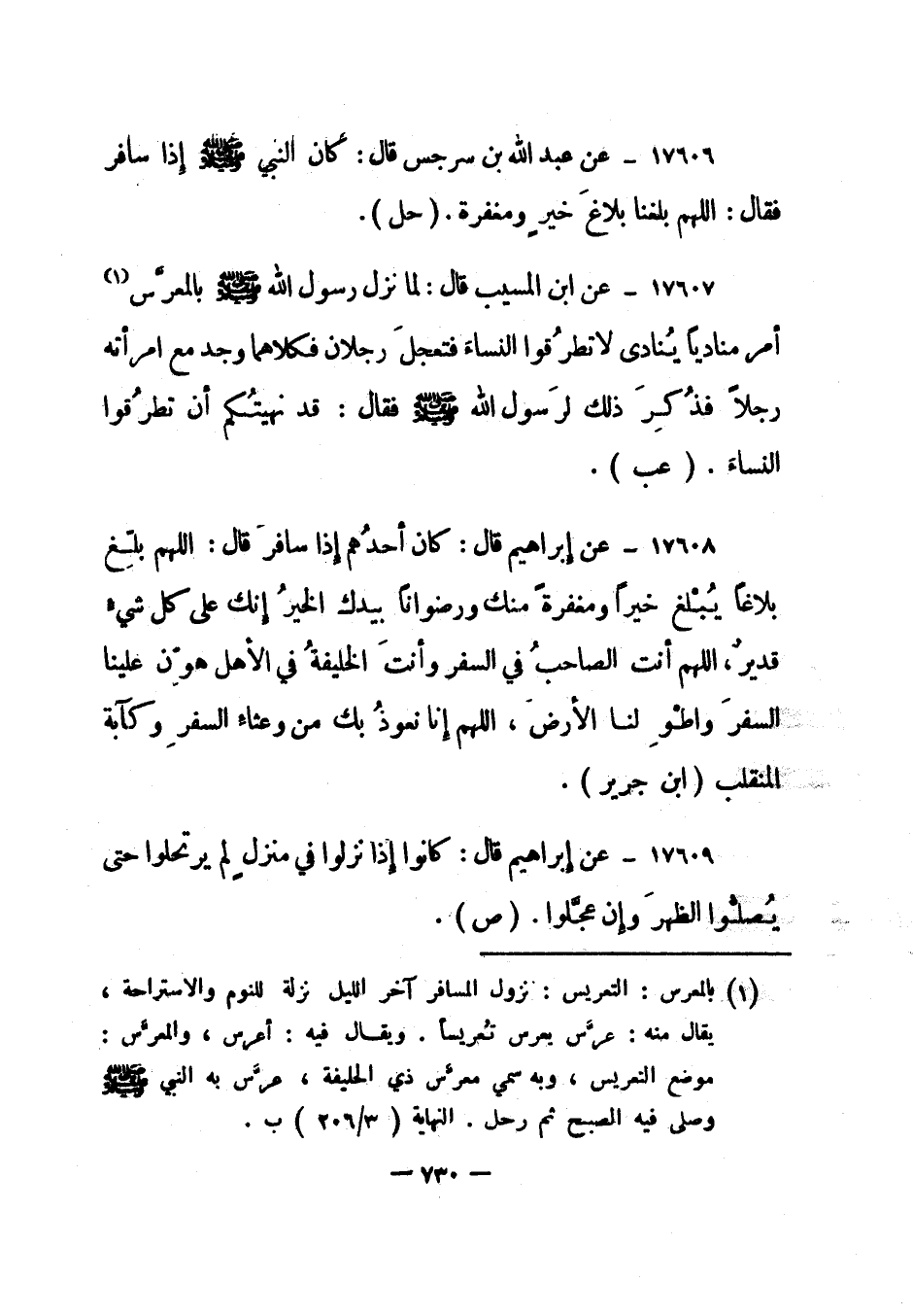 17608- عن إبراهيم قال: "كان أحدهم إذا سافر قال: اللهم بلغ بلاغا يبلغ خيرا ومغفرة منك ورضوانا بيدك الخير إنك على كل شيء قدير، اللهم أنت الصاحب في السفر وأنت الخليفة في الأهل هون علينا السفر واطو لنا الأرض، اللهم إنا نعوذ بك من وعثاء السفر وكآبة المنقلب". "ابن جرير".