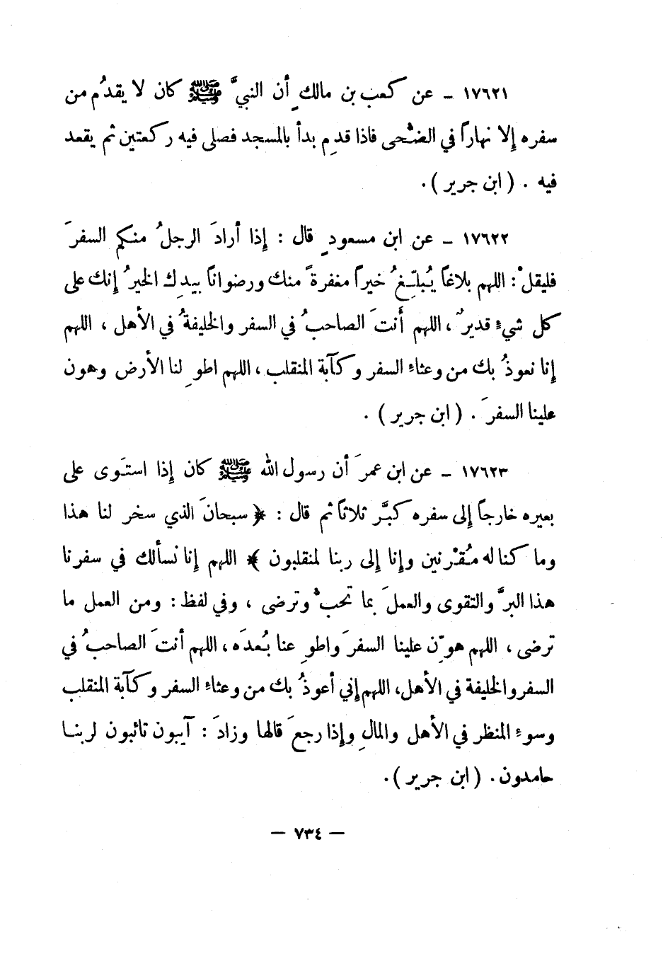 17621- عن كعب بن مالك " أن النبي صلى الله عليه وسلم كان لا يقدم من سفره إلا نهارا في الضحى فإذا قدم بدأ بالمسجد فصلى فيه ركعتين ثم يقعد فيه". "ابن جرير".