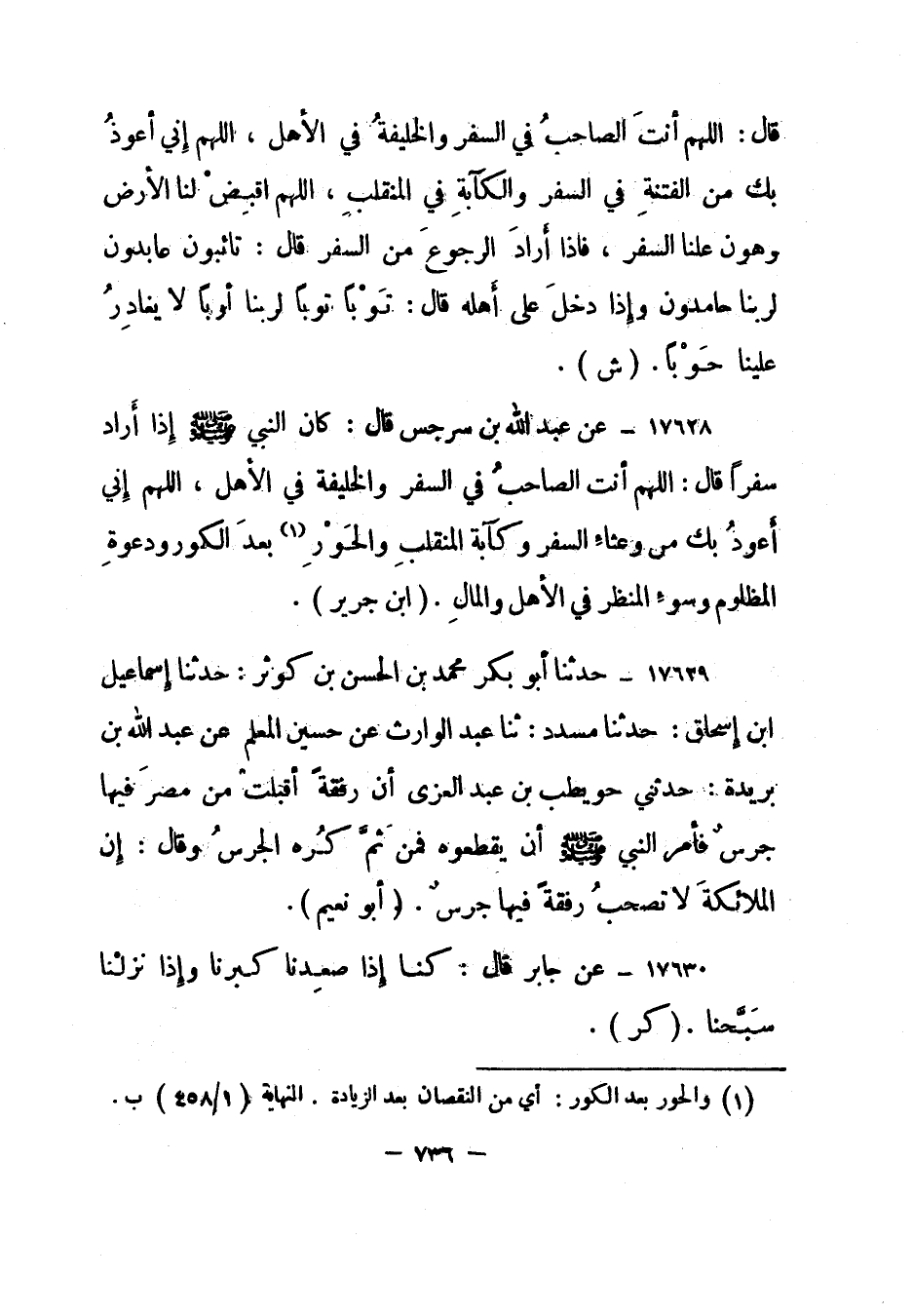 17628- عن عبد الله بن سرجس قال: "كان النبي صلى الله عليه وسلم إذا أراد سفرا قال: اللهم أنت الصاحب في السفر والخليفة في الأهل، اللهم إني أعوذ بك من وعثاء السفر وكآبة المنقلب والحور 1 بعد الكور ودعوة المظلوم وسوء المنظر في الأهل والمال". "ابن جرير".