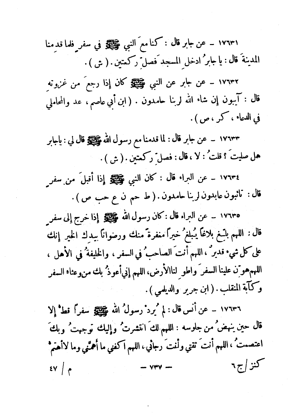 17636- عن أنس قال: "لم يرد رسول الله صلى الله عليه وسلم سفرا قط إلا قال حين ينهض من جلوسه: اللهم لك انتشرت وإليك توجهت وبك اعتصمت، اللهم أنت ثقتي وأنت رجائي، اللهم اكفني ما أهمني وما لا أهتم