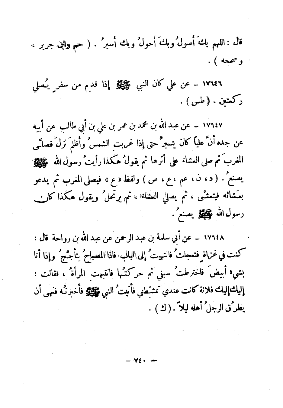 17647- عن عبد الله بن محمد بن عمر بن علي بن أبي طالب عن أبيه عن جده "أن عليا كان يسير حتى إذا غربت الشمس وأظلم نزل فصلى المغرب ثم صلى العشاء على أثرها ثم يقول هكذا رأيت رسول الله صلى الله عليه وسلم يصنع". "د، ن، عم، ع، ص" ولفظ "ع": "فيصلى المغرب ثم يدعو بعشائه فيتعشى، ثم يصلي العشاء، ثم يرتحل ويقول هكذا كان رسول الله صلى الله عليه وسلم يصنع".