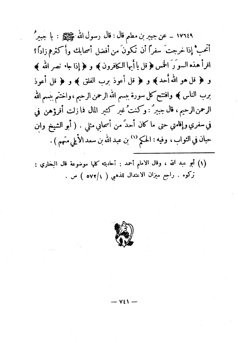 17649- عن جبير بن مطعم قال: قال رسول الله صلى الله عليه وسلم: "يا جبير أتحب إذا خرجت سفرا أن تكون من أفضل أصحابك وأكثرهم زادا؟ اقرأ هذه السور الخمس {قُلْ يَا أَيُّهَا الْكَافِرُونَ} و {إِذَا جَاءَ نَصْرُ اللَّهِ وَالْفَتْحُ} و {قُلْ هُوَ اللَّهُ أَحَدٌ} و {قُلْ أَعُوذُ بِرَبِّ الْفَلَقِ} و {قُلْ أَعُوذُ بِرَبِّ النَّاسِ} وافتتح كل سورة ببسم الله الرحمن الرحيم، واختتم ببسم الله الرحمن الرحيم، قال جبير: وكنت غير كثير المال فما زلت أقرؤهن في سفري وإقامتي حتى ما كان أحد من أصحابي مثلي". "أبو الشيخ وابن حبان في الثواب، وفيه: الحكم 1 بن عبد الله بن سعد الأيلي متهم".