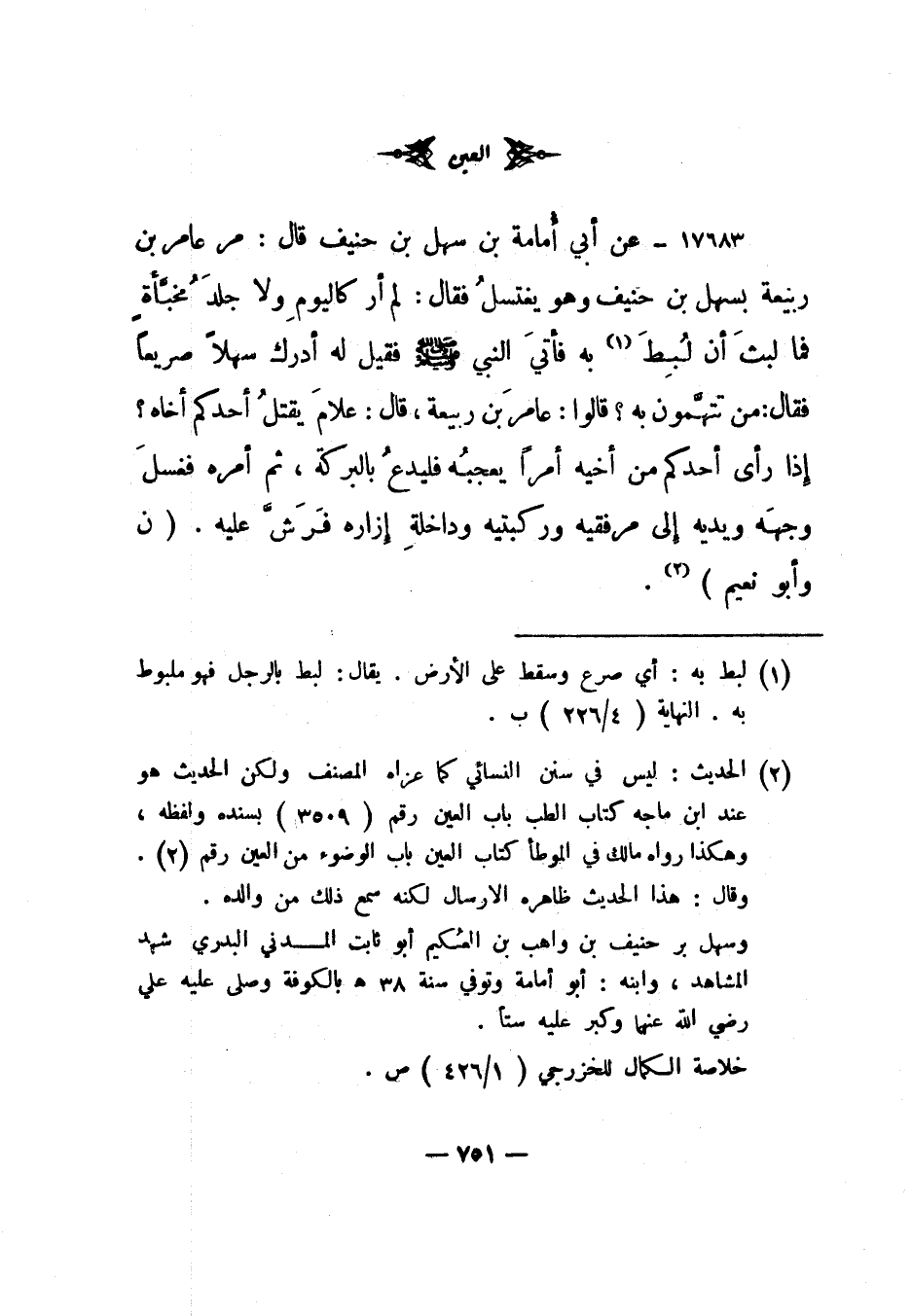 17683- عن أبي أمامة بن سهل بن حنيف قال: "مر عامر بن ربيعة بسهل بن حنيف وهو يغتسل فقال: لم أر كاليوم ولا جلد مخبأة فما لبث أن لبط 1 به فأتى النبي صلى الله عليه وسلم فقيل له أدرك سهلا صريعا فقال: من تتهمون به؟ قالوا: عامر بن ربيعة، قال: علام يقتل أحدكم أخاه؟ إذا رأى أحدكم من أخيه أمرا يعجبه فليدع بالبركة، ثم أمره فغسل وجهه ويديه إلى مرفقيه وركبتيه وداخلة إزاره فرش عليه". "ن وأبو نعيم" 2.