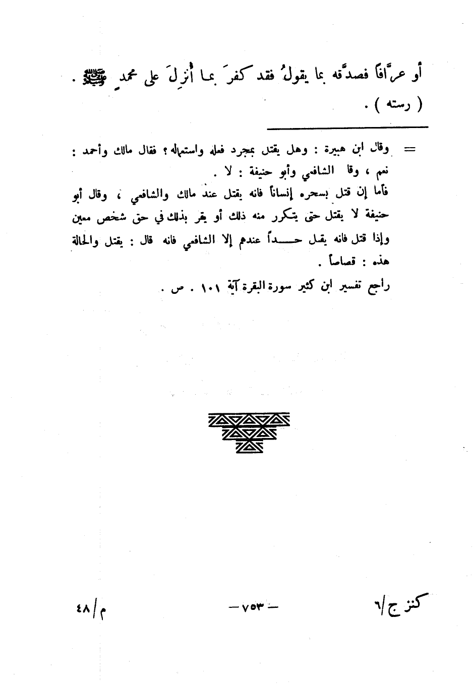 = وقال ابن هبيرة: وهل يقتل بمجرد فعله واستعماله؟ فقال مالك وأحمد: نعم، وقال الشافعي وأبو حنيفة: لا. فأما إن قتل بسحره إنسانا فإنه يقتل عند مالك والشافعي، وقال أبو حنيفة لا يقتل حتى يتكرر منه ذلك أو يقر بذلك في حق شخص معين وإذا قتل فإنه يقتل حدا عندهم إلا الشافعي فإنه قال: يقتل والحالة هذه: قصاصا. راجع تفسير ابن كثير سورة البقرة آية 101. ص.