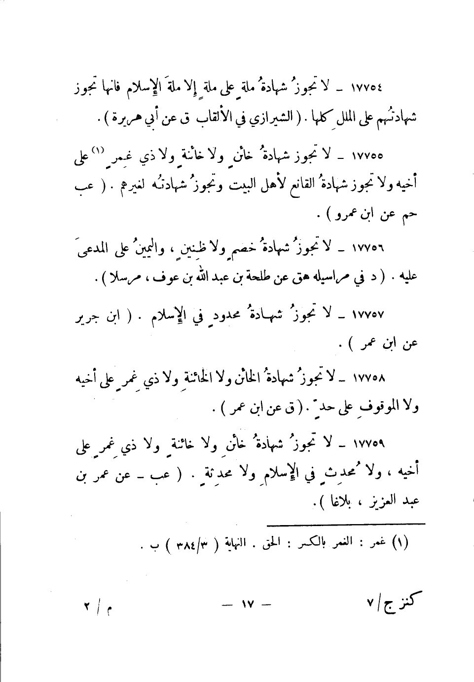 17757- "لا تجوز شهادة محدود في الإسلام". "ابن جرير عن ابن عمر".