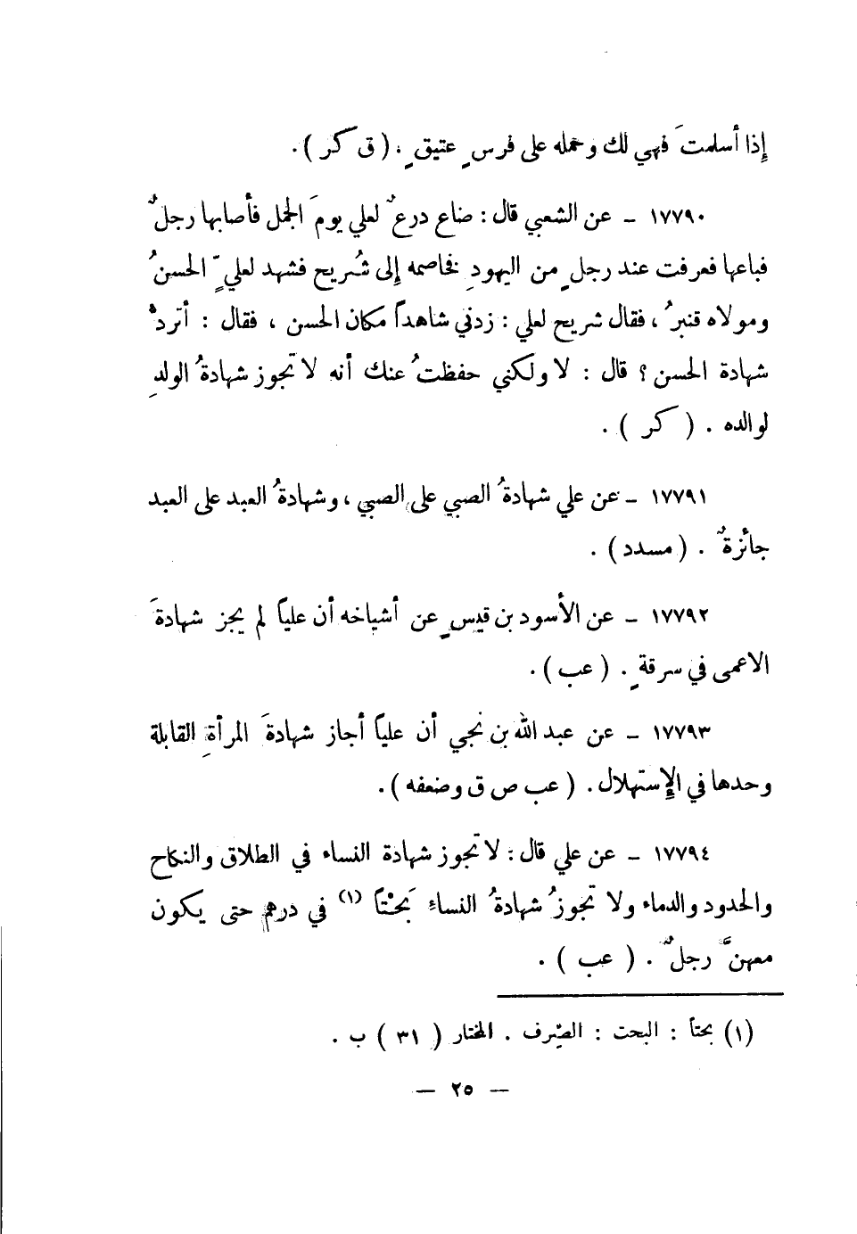 17794- عن علي قال: "لا تجوز شهادة النساء في الطلاق والنكاح والحدود والدماء ولا تجوز شهادة النساء بحتا 1 في درهم حتى يكون معهن رجل."عب".