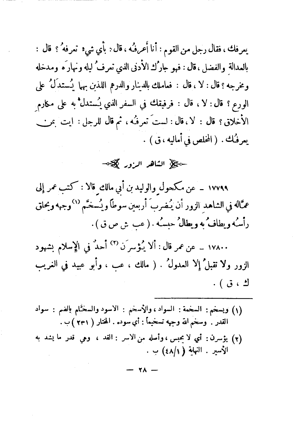 17799- عن مكحول والوليد بن أبي مالك قالا: "كتب عمر إلى عماله في الشاهد الزور أن يضرب أربعين سوطا ويسخم1 وجهه ويحلق رأسه ويطاف به ويطال حبسه". "عب ش ص ق".