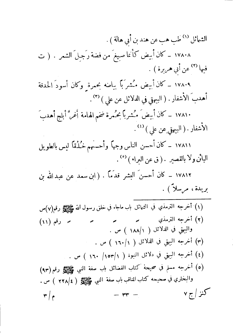 17810- "كان أبيض مشربا بحمرة ضخم الهامة أغر أبلج أهدب الأشفار". "البيهقي عن علي"4