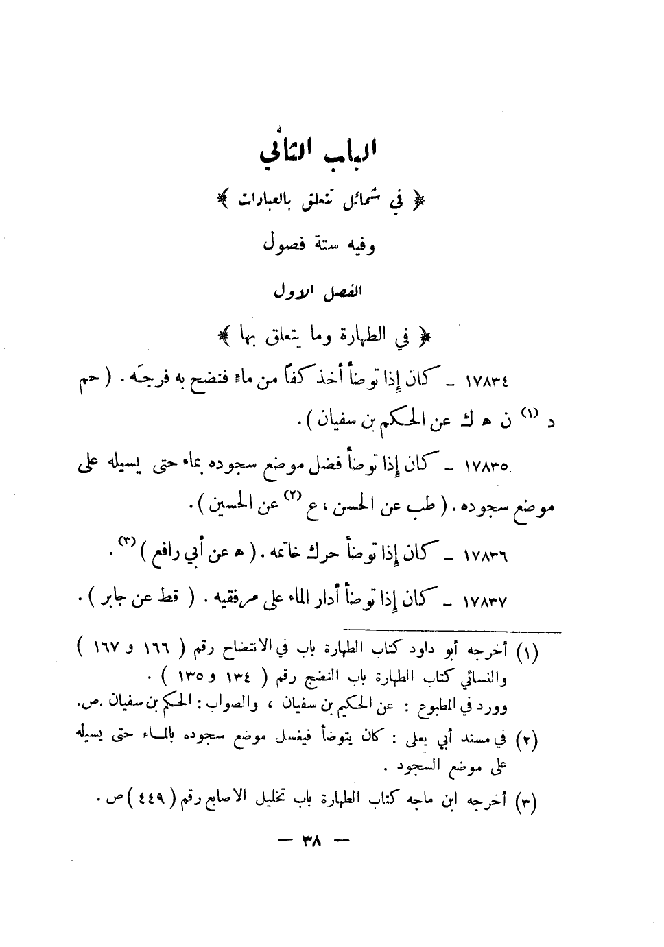 الباب الثاني "في شمائل تتعلق بالعبادات" وفيه ستة فصول