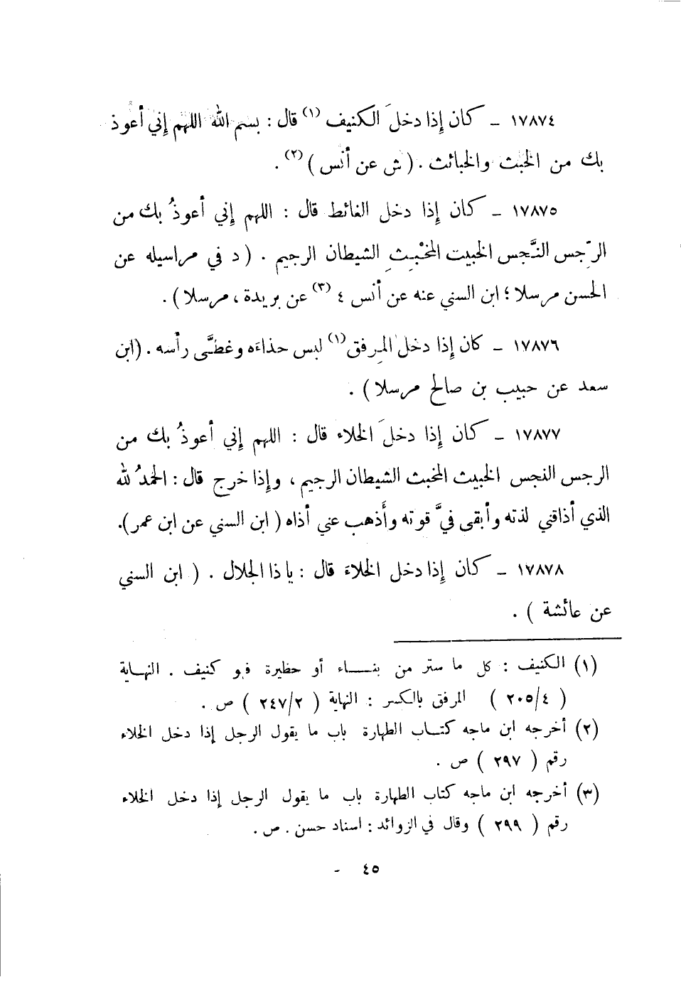 17874- "كان إذا دخل الكنيف1 قال: بسم الله اللهم إني أعوذ بك من الخبث والخبائث". "ش عن أنس"2