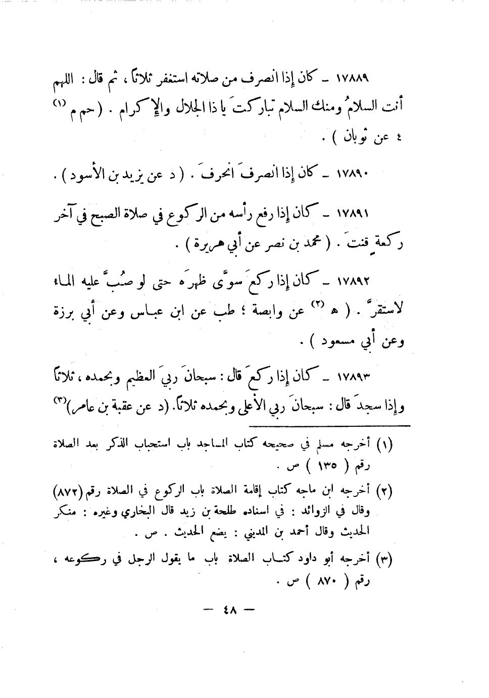 17893- "كان إذا ركع قال: سبحان ربي العظيم وبحمده، ثلاثا وإذا سجد قال: سبحان ربي الأعلى وبحمده ثلاثا". "د عن عقبة بن عامر"3