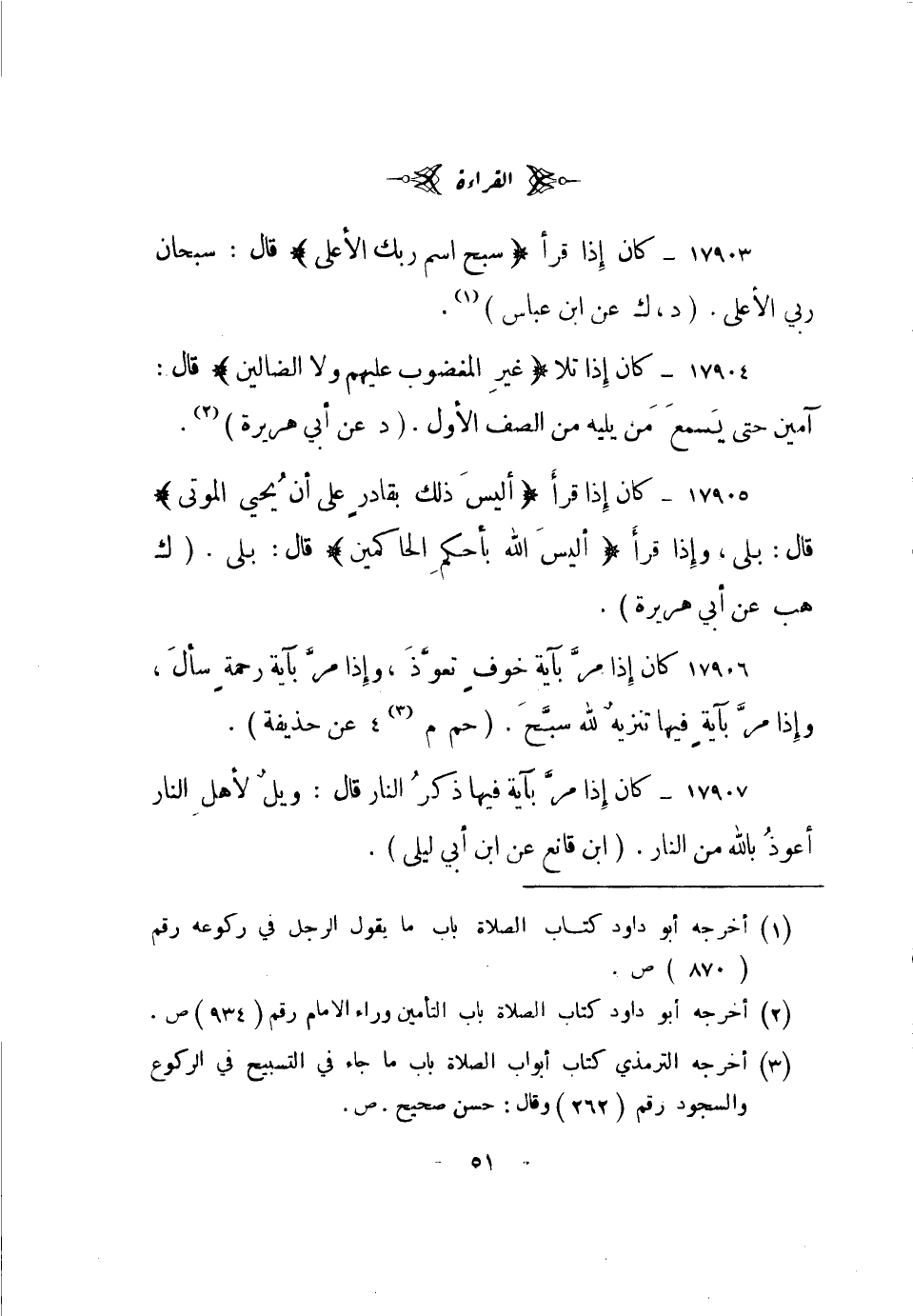17905- "كان إذا قرأ {أَلَيْسَ ذَلِكَ بِقَادِرٍ عَلَى أَنْ يُحْيِيَ الْمَوْتَى} قال: بلى، وإذا قرأ"أليس الله بأحكم الحاكمين" قال: بلى".