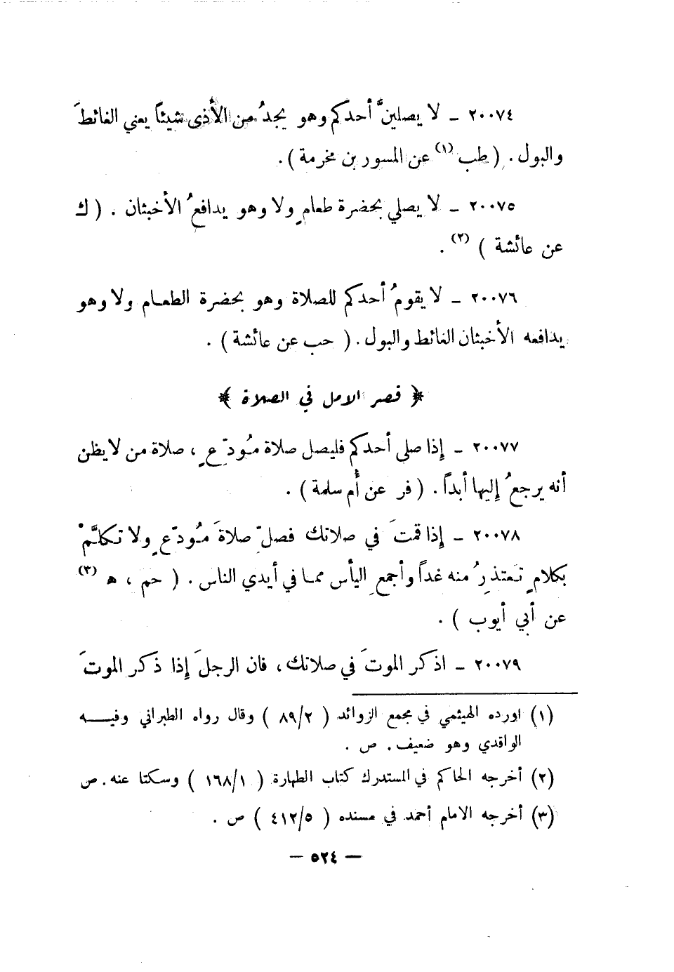 20074- لا يصلين أحدكم وهو يجد من الأذى شيئا يعني الغائط والبول.