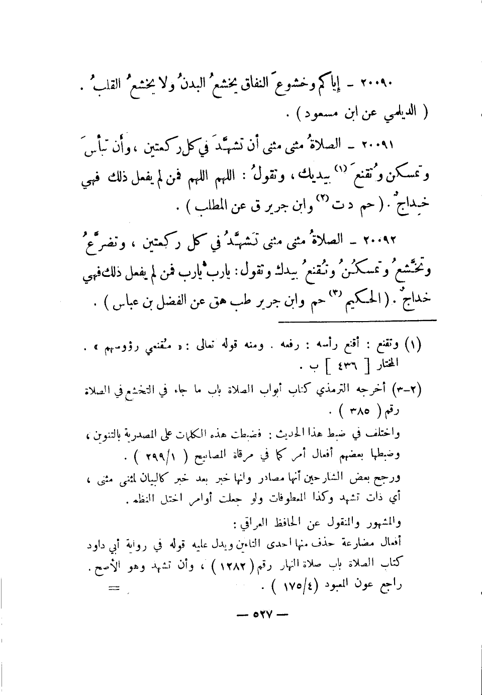 20091- الصلاة مثنى مثنى أن تشهد في كل ركعتين، وأن تبأس وتمسكن وتقنع1 بيديك، وتقول: اللهم اللهم فمن لم يفعل ذلك فهي خداج. "حم د ت2 وابن جرير ق عن المطلب".