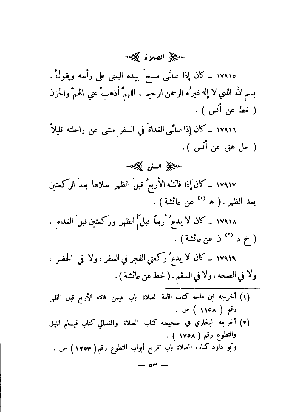 17919- "كان لا يدع ركعتي الفجر في السفر، ولا في الحضر، ولا في الصحة، ولا في السقم". "خط عن عائشة".