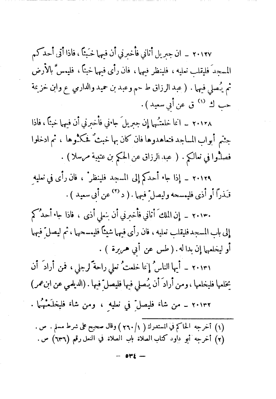 20129- إذا جاء أحدكم إلى المسجد فلينظر، فإن رأى في نعليه قذرا أو أذى فليمسحه وليصل فيهما. "د2 عن أبي سعيد".