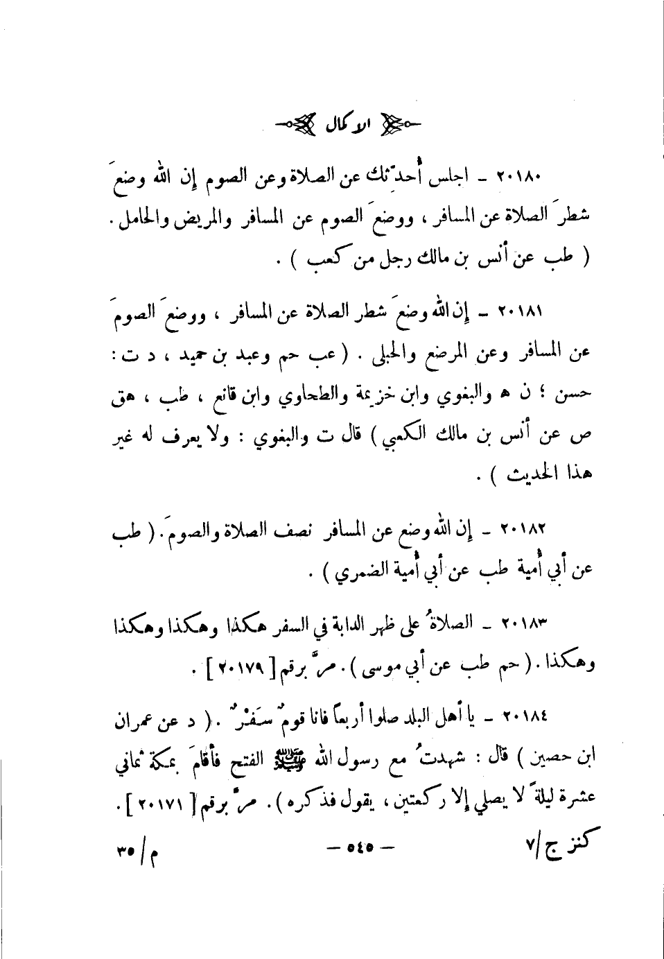 20180- اجلس أحدثك عن الصلاة وعن الصوم إن الله وضع شطر الصلاة عن المسافر، ووضع الصوم عن المسافر والمريض والحامل. "طب عن أنس بن مالك رجل من كعب".