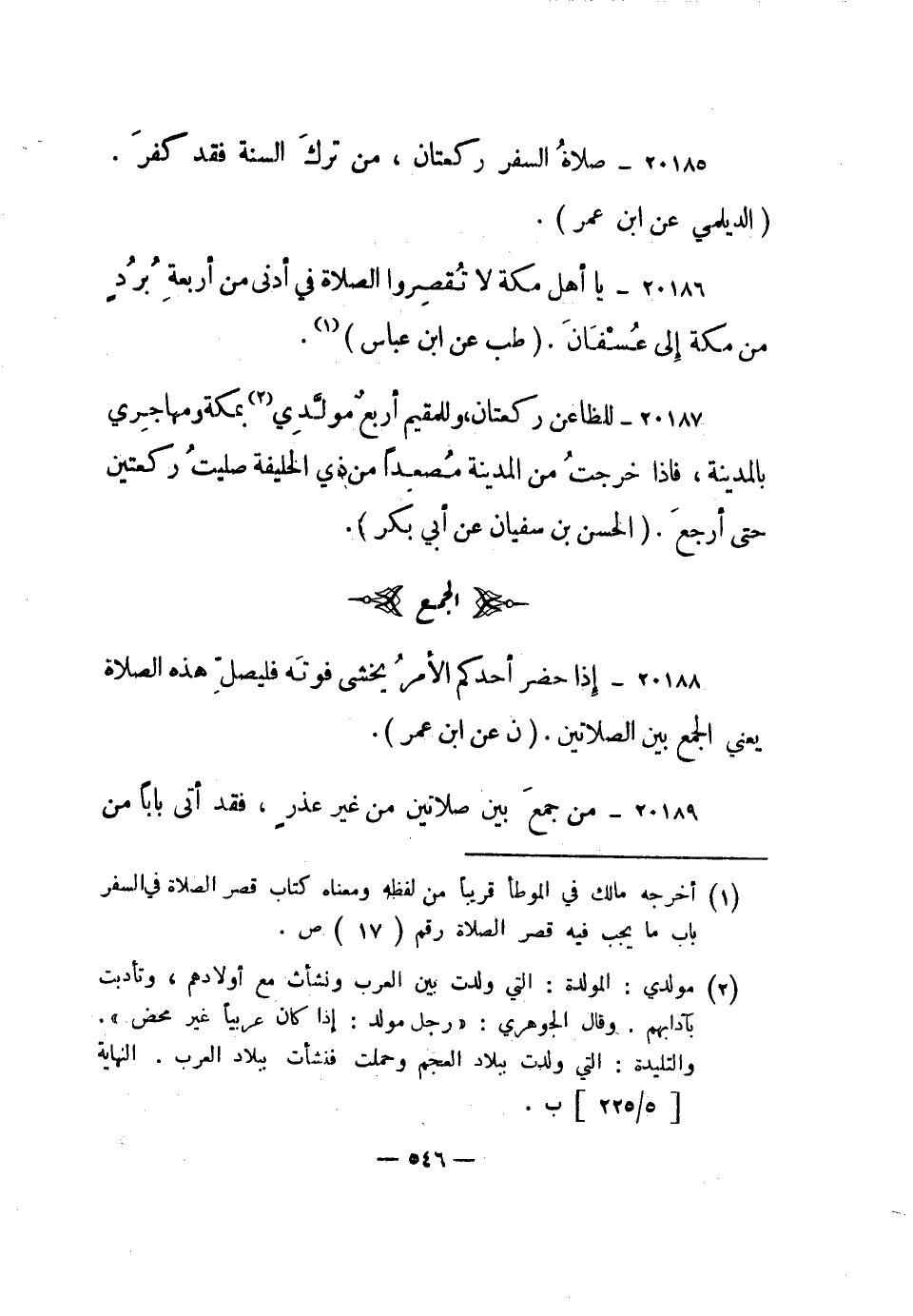 20185- صلاة السفر ركعتان، من ترك السنة فقد كفر. "الديلمي عن ابن عمر".