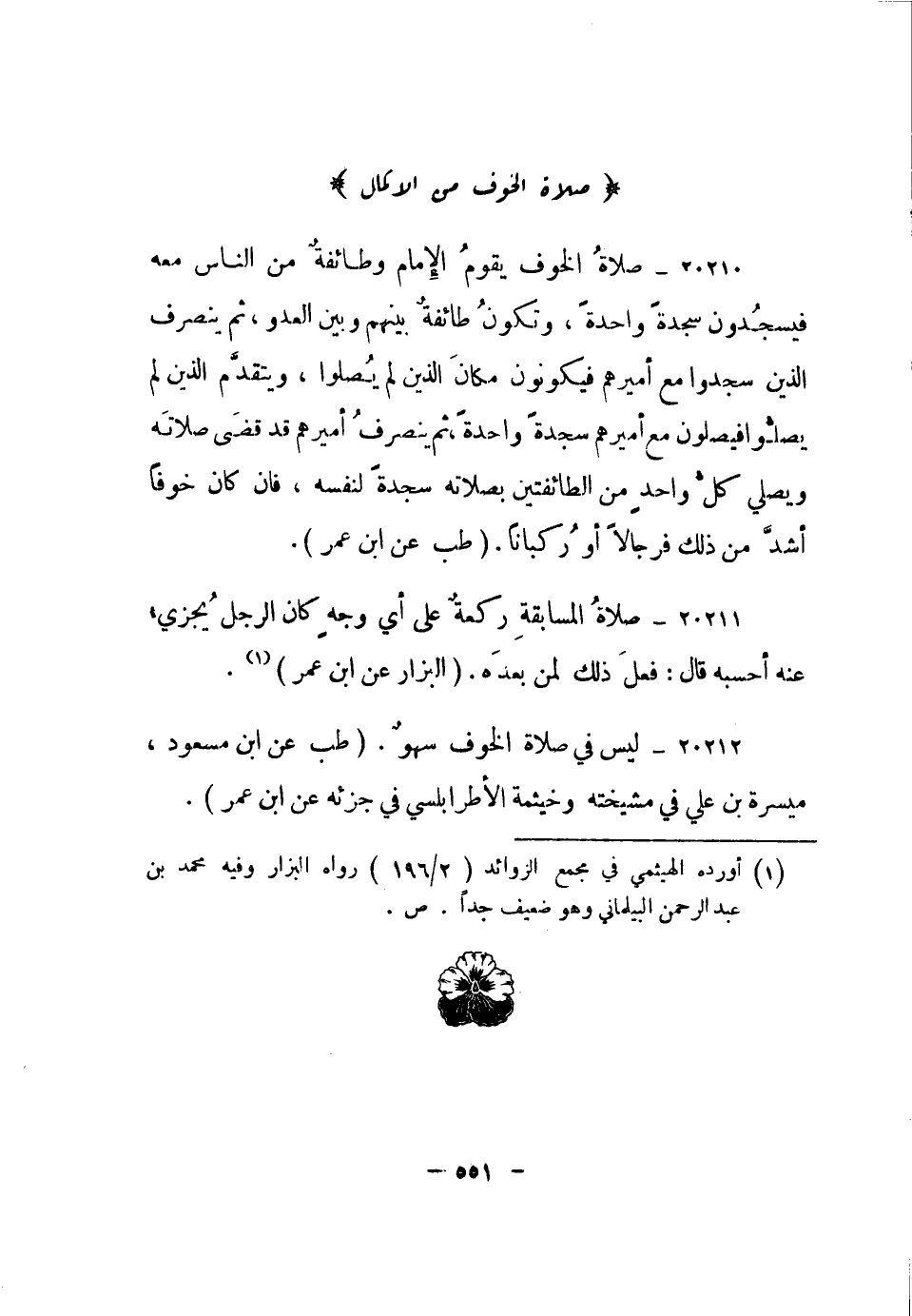 20210- صلاة الخوف يقوم الإمام وطائفة من الناس معه فيسجدون سجدة واحدة، وتكون طائفة بينهم وبين العدو، ثم ينصرف الذين سجدوا مع أميرهم فيكونون مكان الذين لم يصلوا، ويتقدم الذين لم يصلوا فيصلون مع أميرهم سجدة واحدة، ثم ينصرف أميرهم قد قضى صلاته ويصلي كل واحد من الطائفتين بصلاته سجدة لنفسه، فإن كان خوفا أشد من ذلك فرجالا أو ركبانا. "طب عن ابن عمر".