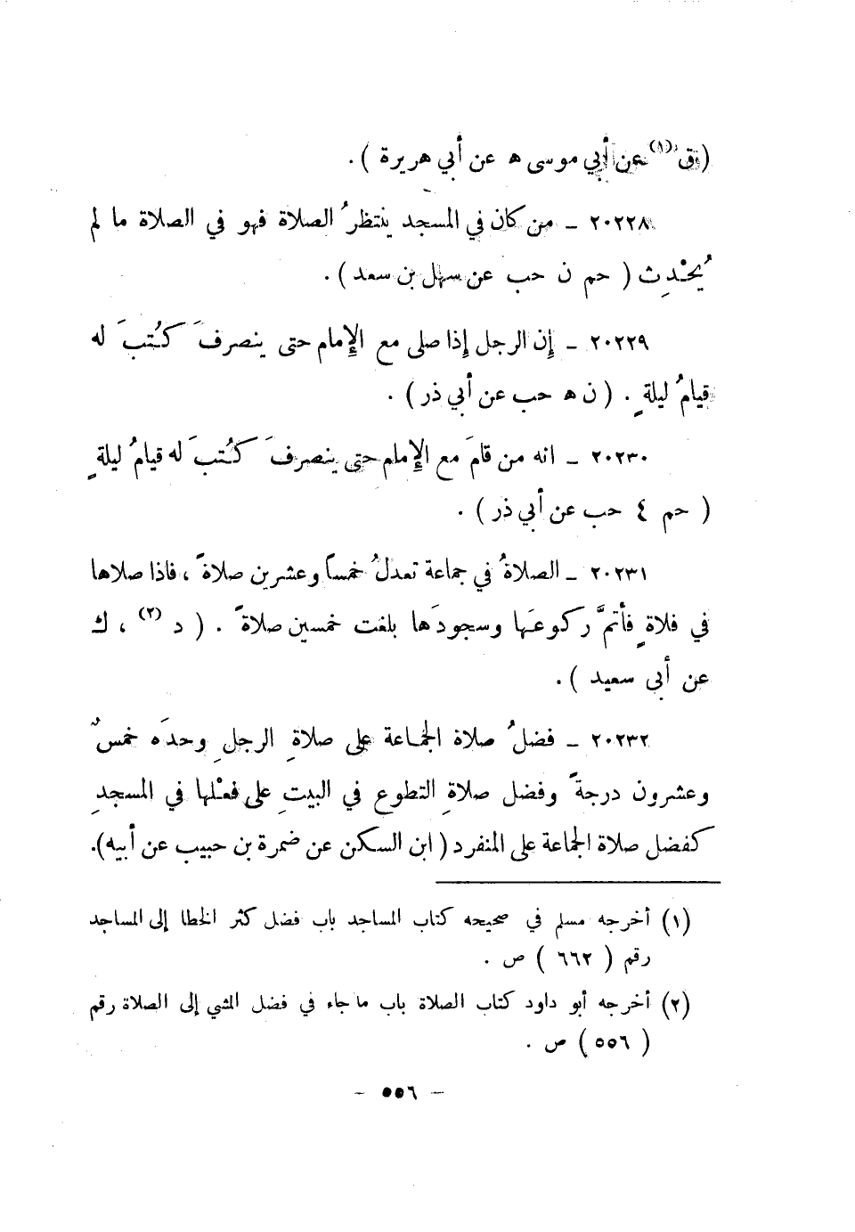 20231- الصلاة في جماعة تعدل خمسا وعشرين صلاة، فإذا صلاها في فلاة فأتم ركوعها وسجودها بلغت خمسين صلاة. "د2 ك عن أبي سعيد".