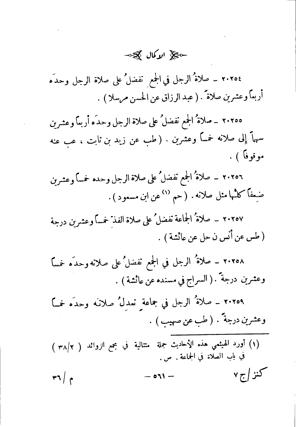 20258- صلاة الرجل في الجمع تفضل على صلاته وحده خمسا وعشرين درجة. "السراج في مسنده عن عائشة".