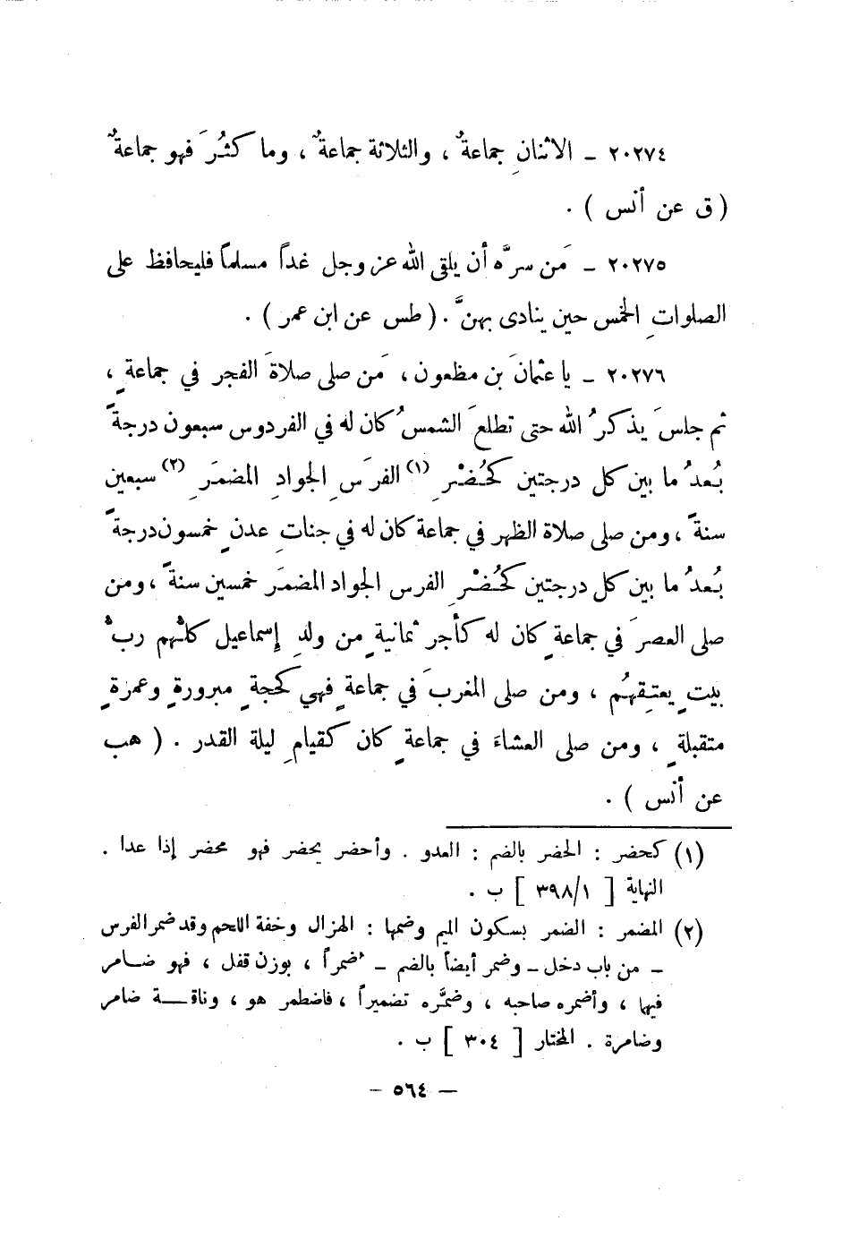 20276- يا عثمان بن مظعون، من صلى الفجر في جماعة، ثم جلس يذكر الله حتى تطلع الشمس كان له في الفردوس سبعون درجة بعد ما بين كل درجتين كحضر1 الفرس الجواد المضمر2 سبعين سنة، ومن صلى صلاة الظهر في جماعة كان له في جنات عدن خمسون درجة بعد ما بين كل درجتين كحضر الفرس الجواد المضمر خمسين سنة، ومن صلى العصر في جماعة كان له كأجر ثمانية من ولد إسماعيل كلهم رب بيت يعتقهم، ومن صلى المغرب في جماعة فهي كحجة مبرورة وعمرة متقبلة، ومن صلى العشاء في جماعة كان كقيام ليلة القدر. "هب عن أنس".