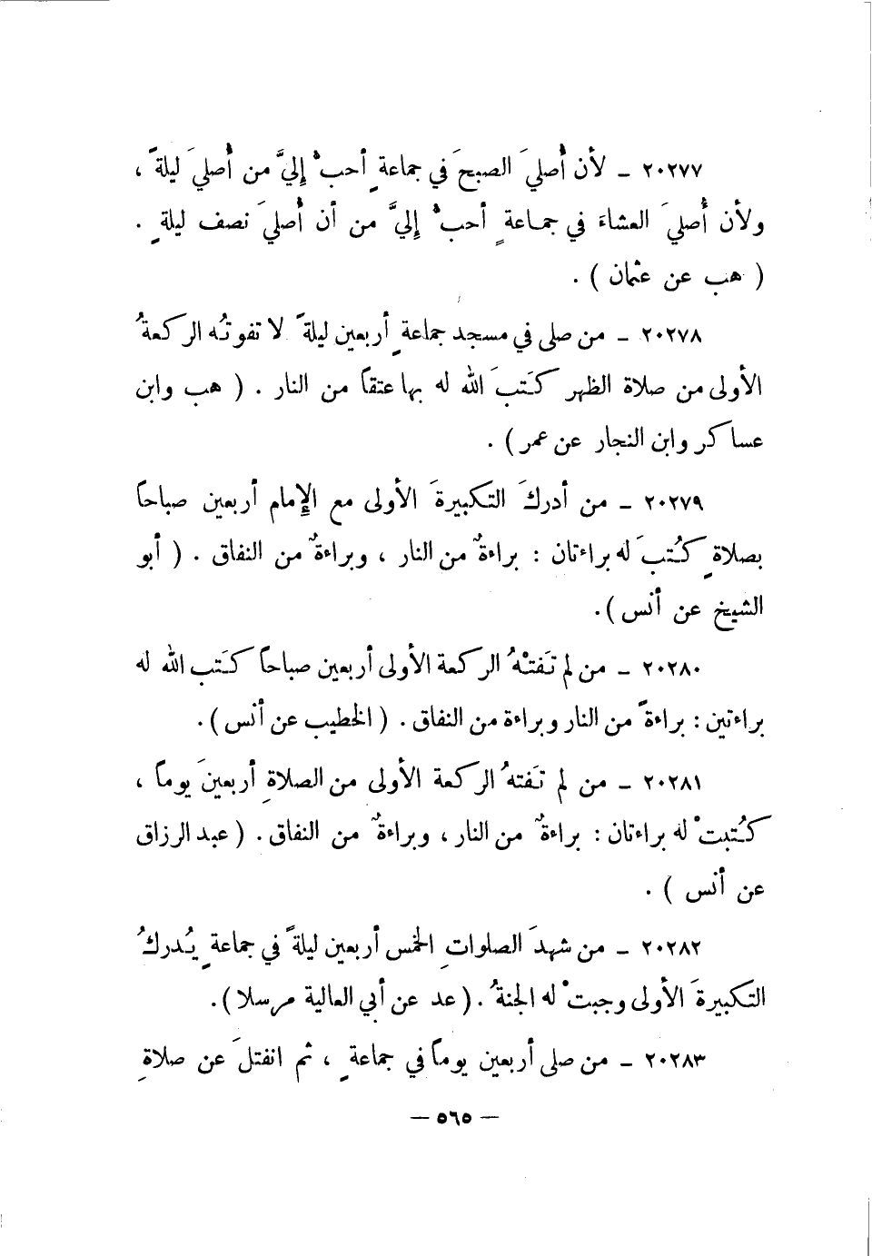 20282- من شهد الصلوات الخمس أربعين ليلة في جماعة يدرك التكبيرة الأولى وجبت له الجنة. "عد عن أبي العالية مرسلا".
