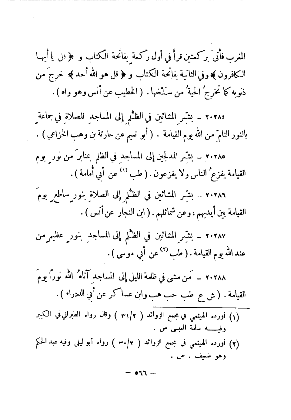 20284- بشر المشائين في الظلم إلى المساجد للصلاة في جماعة بالنور التام من الله يوم القيامة. "أبو نعيم عن حارثة بن وهب الخزاعي".