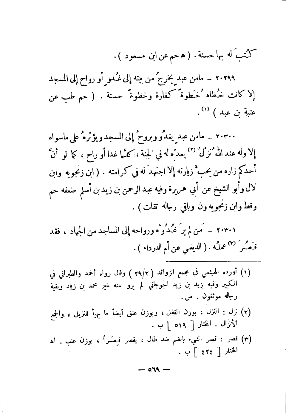 20299- ما من عبد يخرج من بيته إلى غدو أو رواح إلى المسجد إلا كانت خطاه خطوة كفارة وخطوة حسنة. "حم طب عن عتبة بن عبد"1