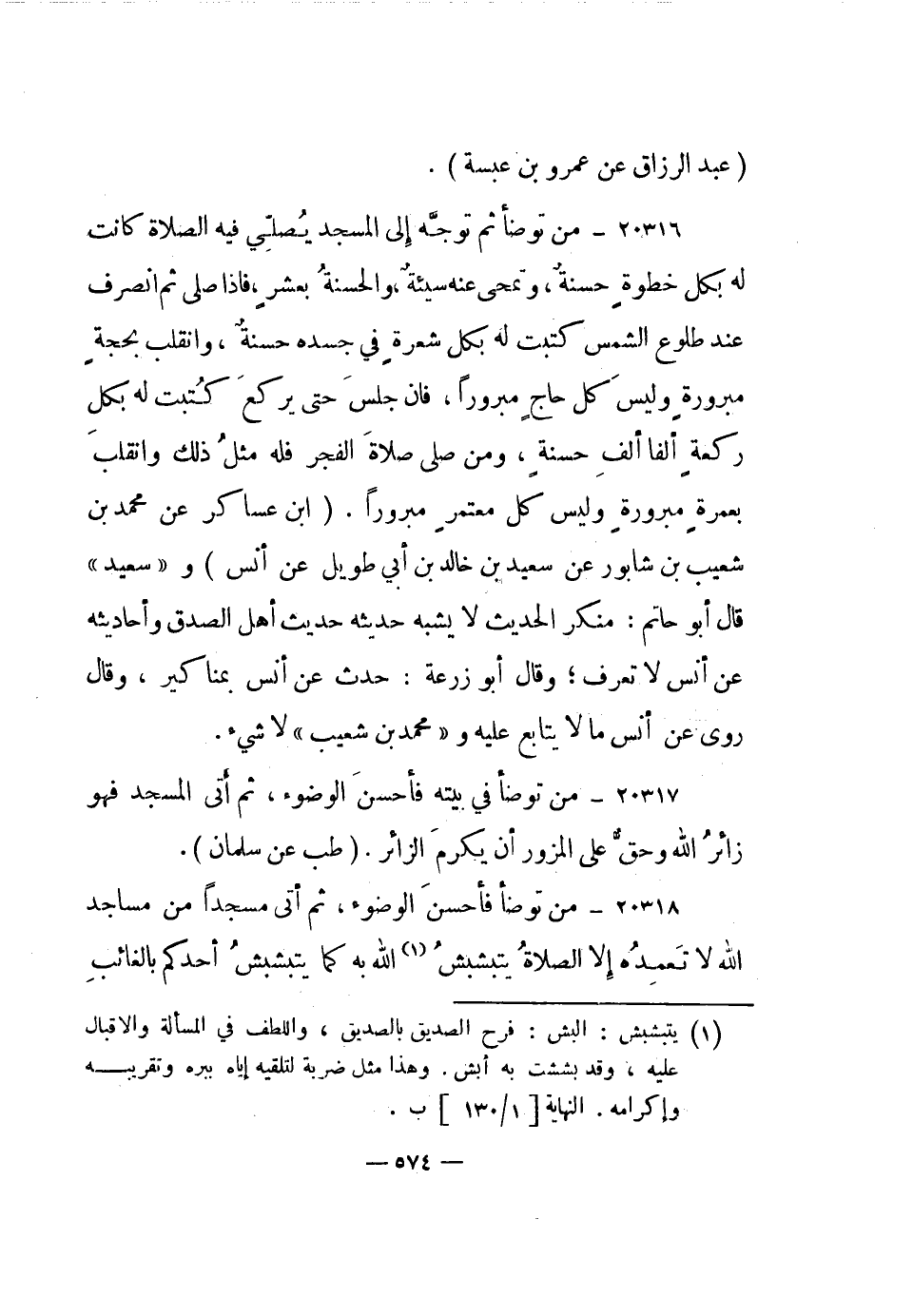 20316- من توضأ ثم توجه إلى المسجد يصلي فيه الصلاة كانت له بكل خطوة حسنة، وتمحى عنه سيئة، والحسنة بعشر، فإذا صلى ثم انصرف عند طلوع الشمس كتبت له بكل شعرة في جسده حسنة، وانقلب بحجة مبرورة وليس كل حاج مبرورا، فإن جلس حتى يركع كتبت له بكل ركعة ألفا ألف حسنة، ومن صلى صلاة الفجر فله مثل ذلك وانقلب بعمرة مبرورة وليس كل معتمر مبرورا.
