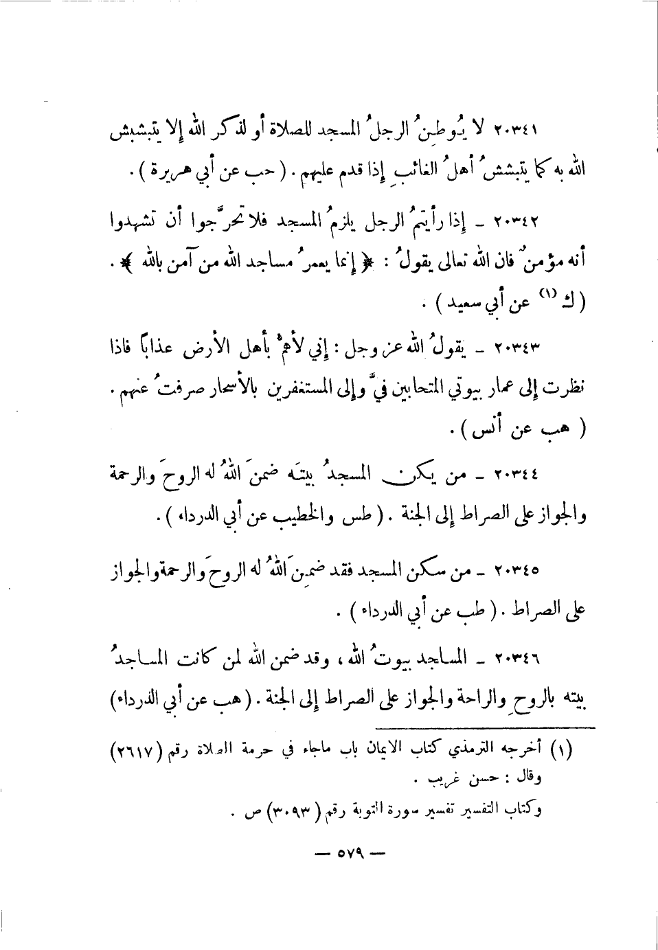 20346- المساجد بيوت الله، وقد ضمن الله لمن كانت المساجد بيته بالروح والراحة والجواز على الصراط إلى الجنة. "هب عن أبي الدرداء".