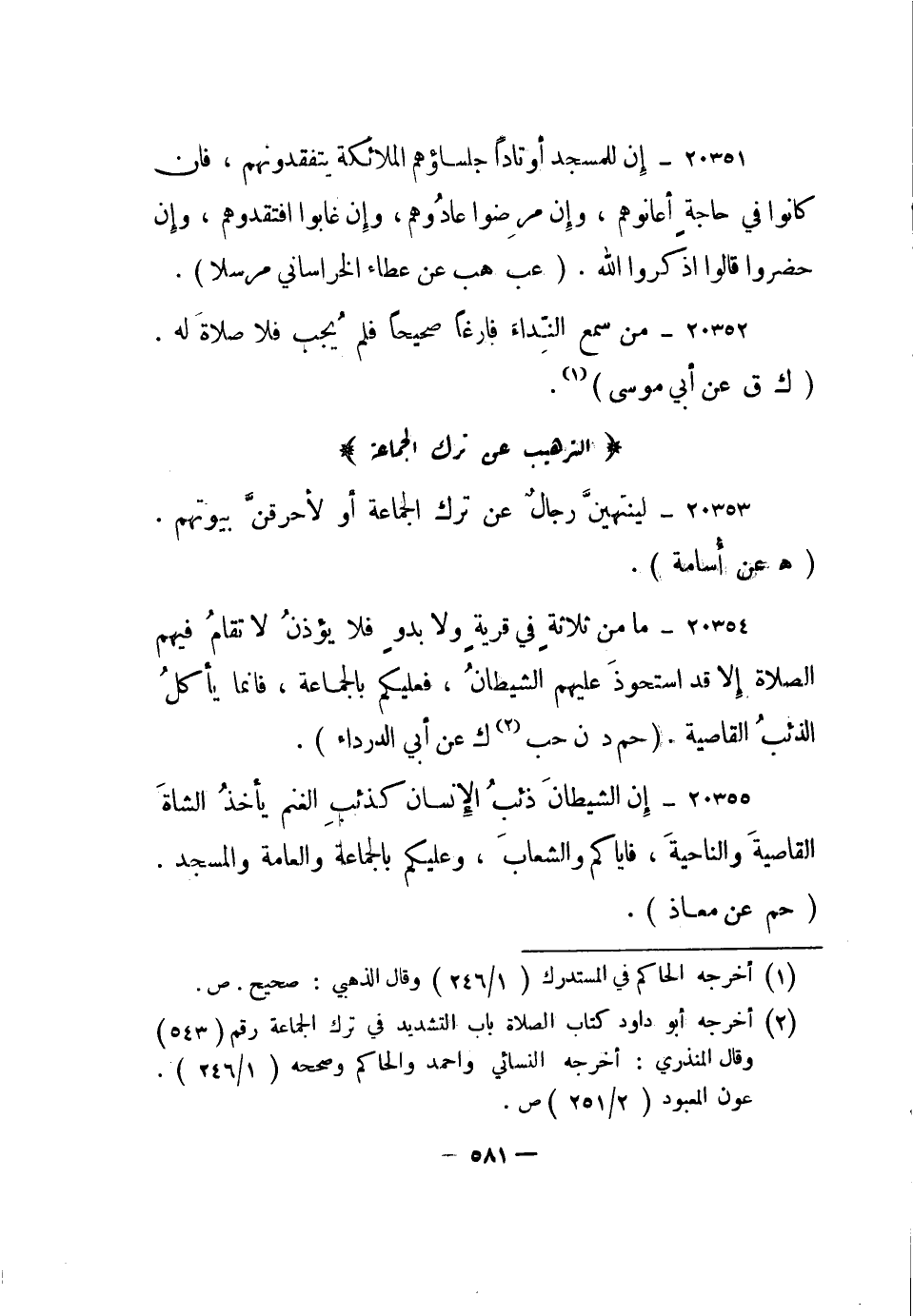 20354- ما من ثلاثة في قرية ولا بدو فلا يؤذن لا تقام فيهم الصلاة إلا قد استحوذ عليهم الشيطان، فعليكم بالجماعة، فإنما يأكل الذئب القاصية.