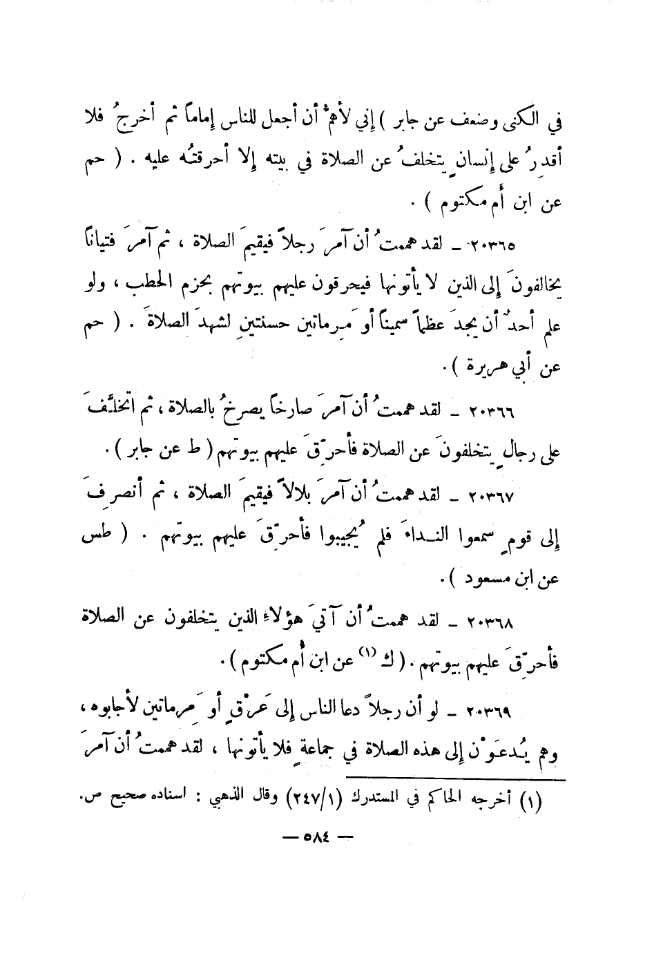 20368- لقد هممت أن آتي هؤلاء الذين يتخلفون عن الصلاة فأحرق عليهم بيوتهم. "ك1 عن ابن أم مكتوم".