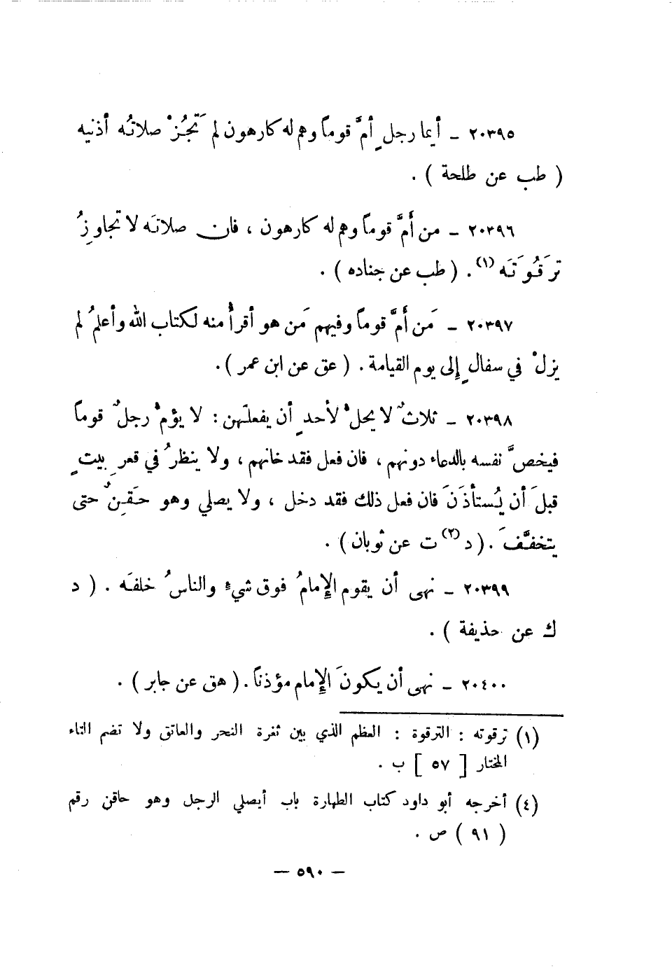 20395- أيما رجل أم قوما وهم له كارهون لم تجز صلاته أذنيه. "طب عن طلحة".