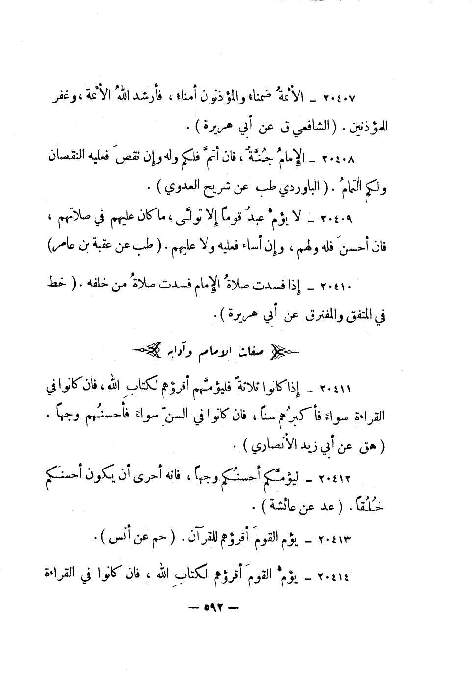 20414- يؤم القوم أقرؤهم لكتاب الله، فإن كانوا في القراءة
