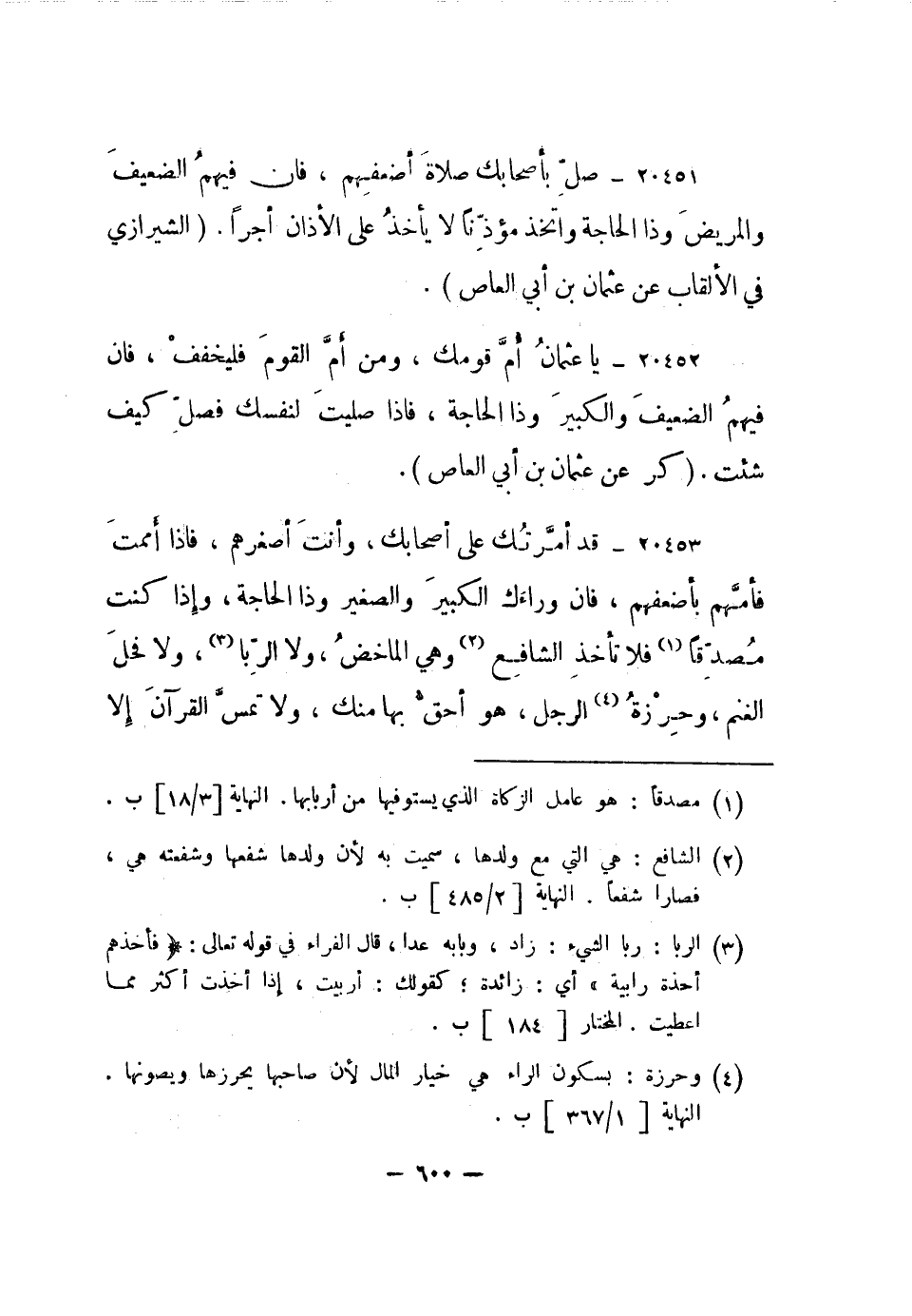 20453- قد أمرتك على أصحابك، وأنت أصغرهم، فإذا أممت فأمهم بأضعفهم، فإن وراءك الكبير والصغير وذا الحاجة، وإذا كنت مصدقا1 فلا تأخذ الشافع2 وهي الماخض، ولا الربا3 ولا فحل الغنم، وحرزة4 الرجل، هو أحق بها منك، ولا تمس القرآن إلا