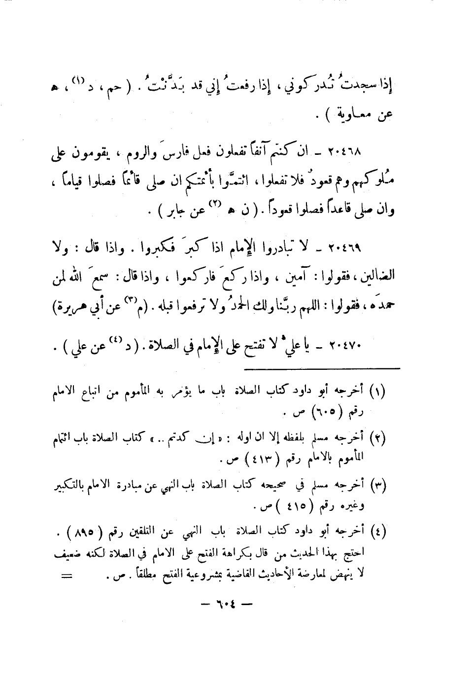 20469- لا تبادروا الإمام إذا كبر فكبروا. وإذا قال: ولا الضالين، فقولوا: آمين، وإذا ركع فاركعوا، وإذا قال: سمع الله لمن حمده، فقولوا: اللهم ربنا ولك الحمد ولا ترفعوا قبله. "م3 عن أبي هريرة".