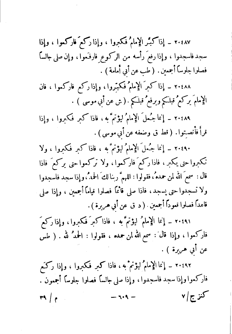 20487- إذا كبر الإمام فكبروا، وإذا ركع فاركعوا، وإذا سجد فاسجدوا، وإذا رفع رأسه من الركوع فارفعوا، وإن صلى جالسا فصلوا جلوسا أجمعين.