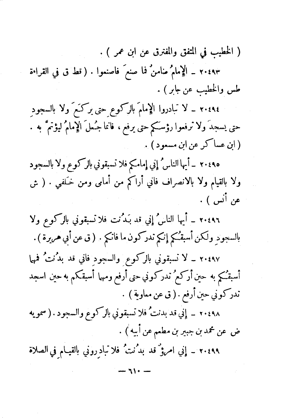20494- لا تبادروا الإمام بالركوع حتى يركع ولا بالسجود حتى يسجد ولا ترفعوا رؤسكم حتى يرفع، فإنما جعل الإمام ليؤتم به. "ابن عساكر عن ابن مسعود".