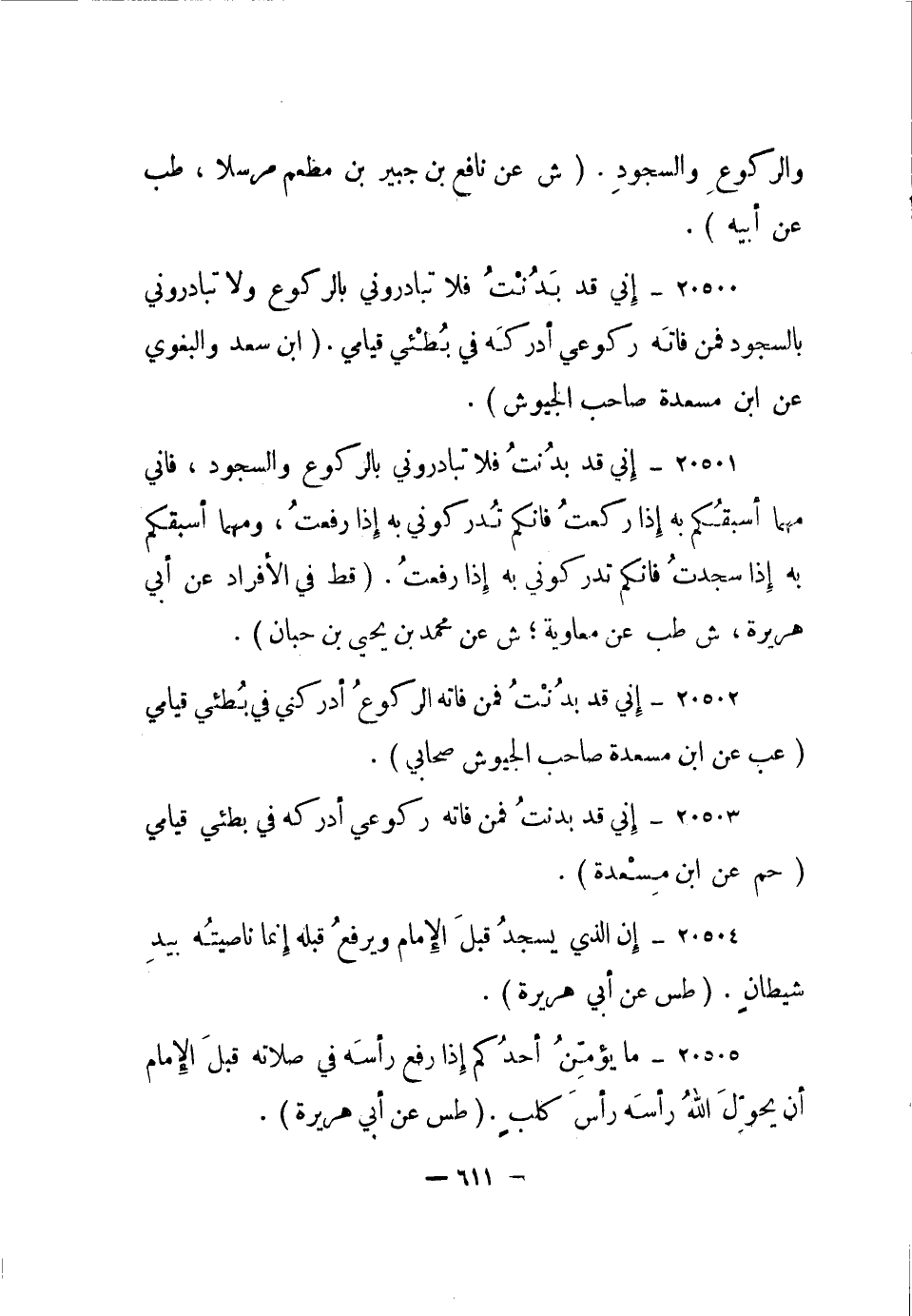 20500- إني قد بدنت فلا تبادروني بالركوع ولا تبادروني بالسجود فمن فاته ركوعي أدركه في بطئي قيامي. "ابن سعد والبغوي عن ابن مسعدة صاحب الجيوش".