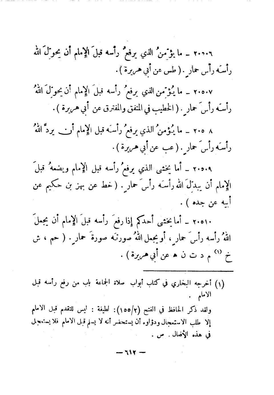 20509- أما يخشى الذي يرفع رأسه قبل الإمام ويضعه قبل الإمام أن يبدل الله رأسه رأس حمار. "خط عن بهز بن حكيم عن أبيه عن جده".