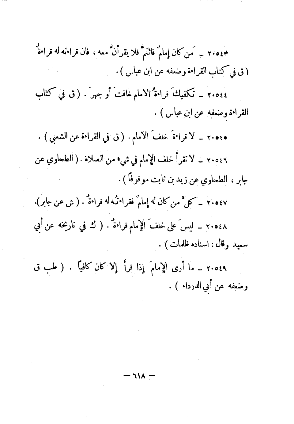 20544- تكفيك قراءة الإمام خافت أو جهر. "ق في كتاب القراءة وضعفه عن ابن عباس".