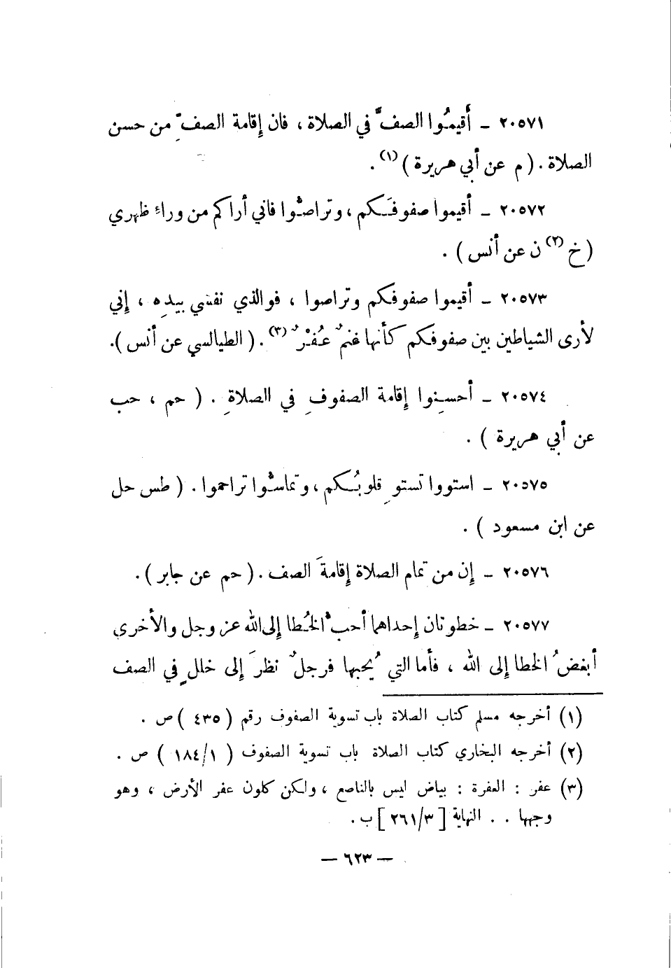 20573- أقيموا صفوفكم وتراصوا، فوالذي نفسي بيده، إني لأرى الشياطين بين صفوفكم كأنها غنم عفر3 "الطيالسي عن أنس".