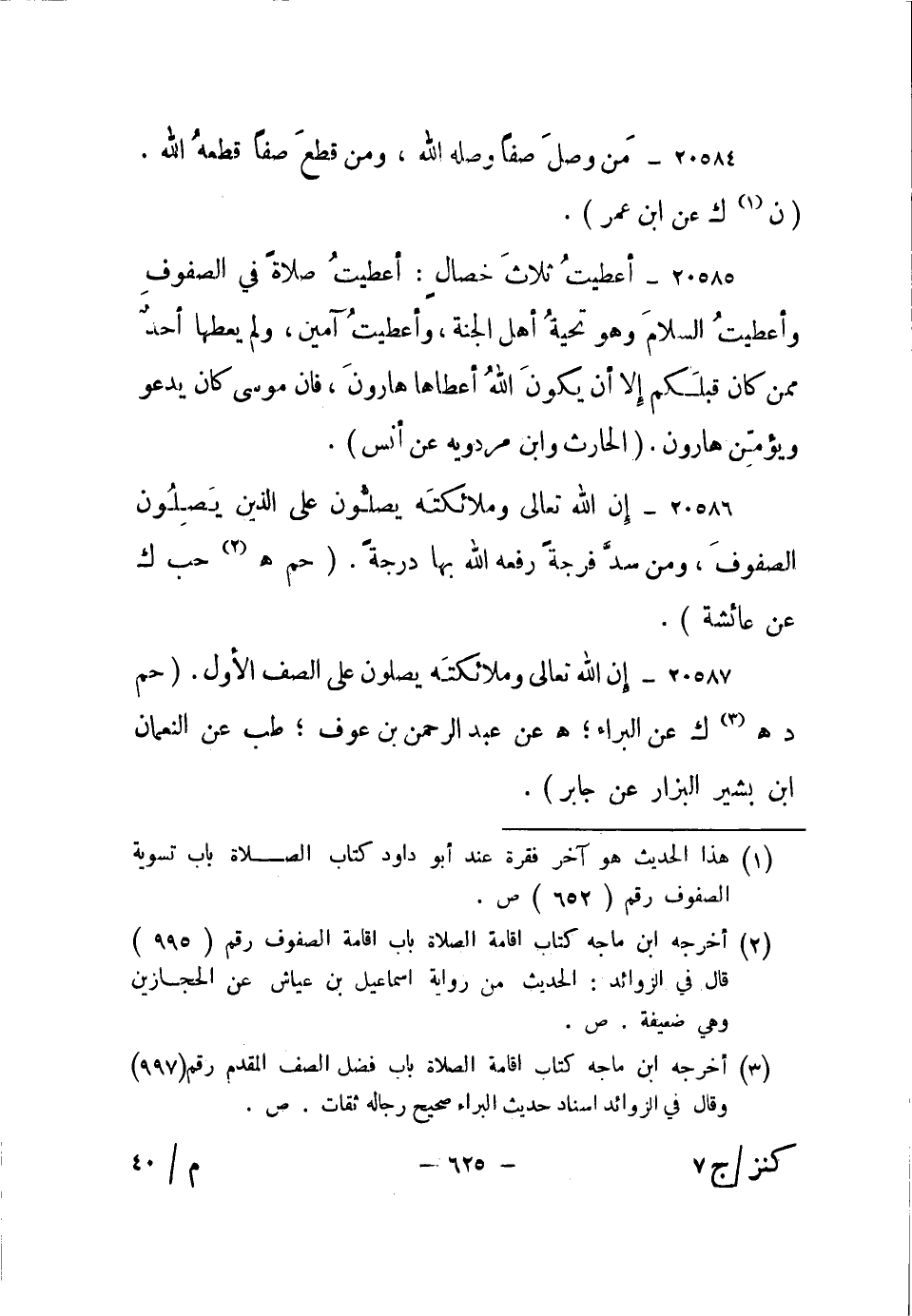 20587- إن الله تعالى وملائكته يصلون على الصف الأول. "حم د هـ3 ك عن البراء؛ هـ عن عبد الرحمن بن عوف؛ طب عن النعمان بن بشير البزار عن جابر".