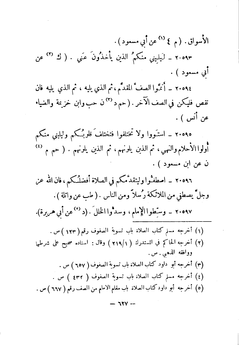 20595- استووا ولا تختلفوا فتختلف قلوبكم وليليني منكم أولوا الأحلام والنهي، ثم الذين يلونهم، ثم الذين يلونهم. "حم م4 ن عن ابن مسعود".