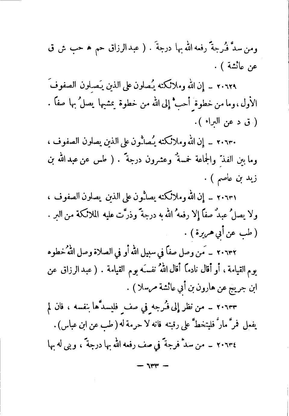 20630- إن الله وملائكته يصلون على الذين يصلون الصفوف، وما بين الفذ والجماعة خمسة وعشرون درجة. "طس عن عبد الله بن زيد بن عاصم".