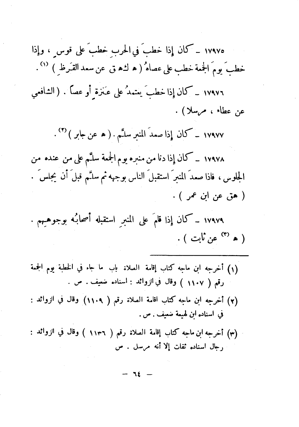 1 أخرجه ابن ماجه كتاب إقامة الصلاة باب ما جاء في الخطبة يوم الجمعة رقم "1107" وقال في الزوائد: إسناده ضعيف. ص