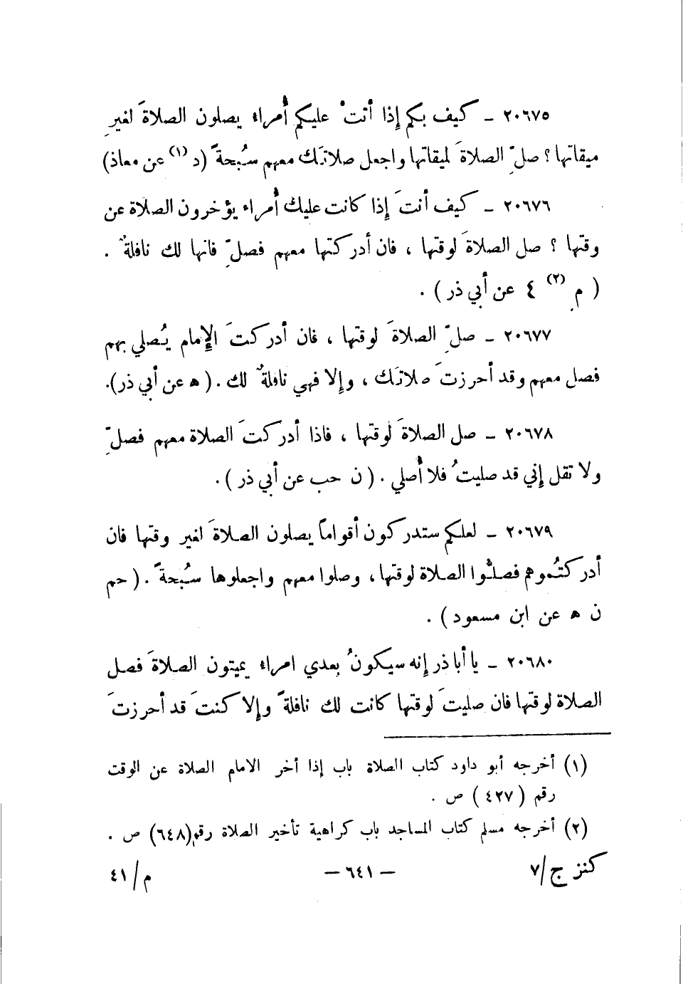 20675- كيف بكم إذا أتت عليكم أمراء يصلون الصلاة لغير ميقاتها؟ صل الصلاة لميقاتها واجعل صلاتك معهم سبحة. "د1 عن معاذ".