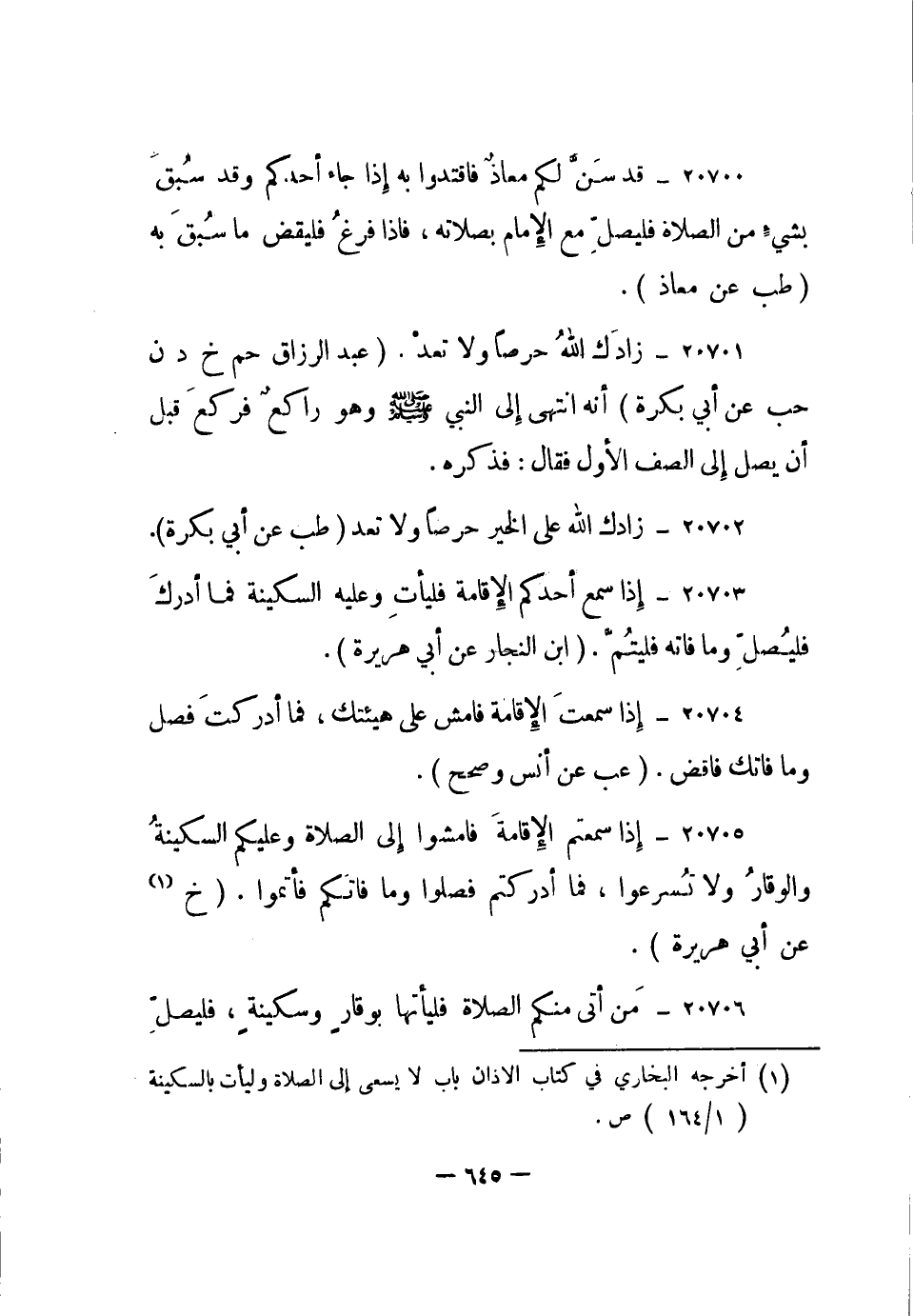 20705- إذا سمعتم الإقامة فامشوا إلى الصلاة وعليكم السكينة والوقار ولا تسرعوا، فما أدركتم فصلوا وما فاتكم فأتموا. "خ1 عن أبي هريرة".
