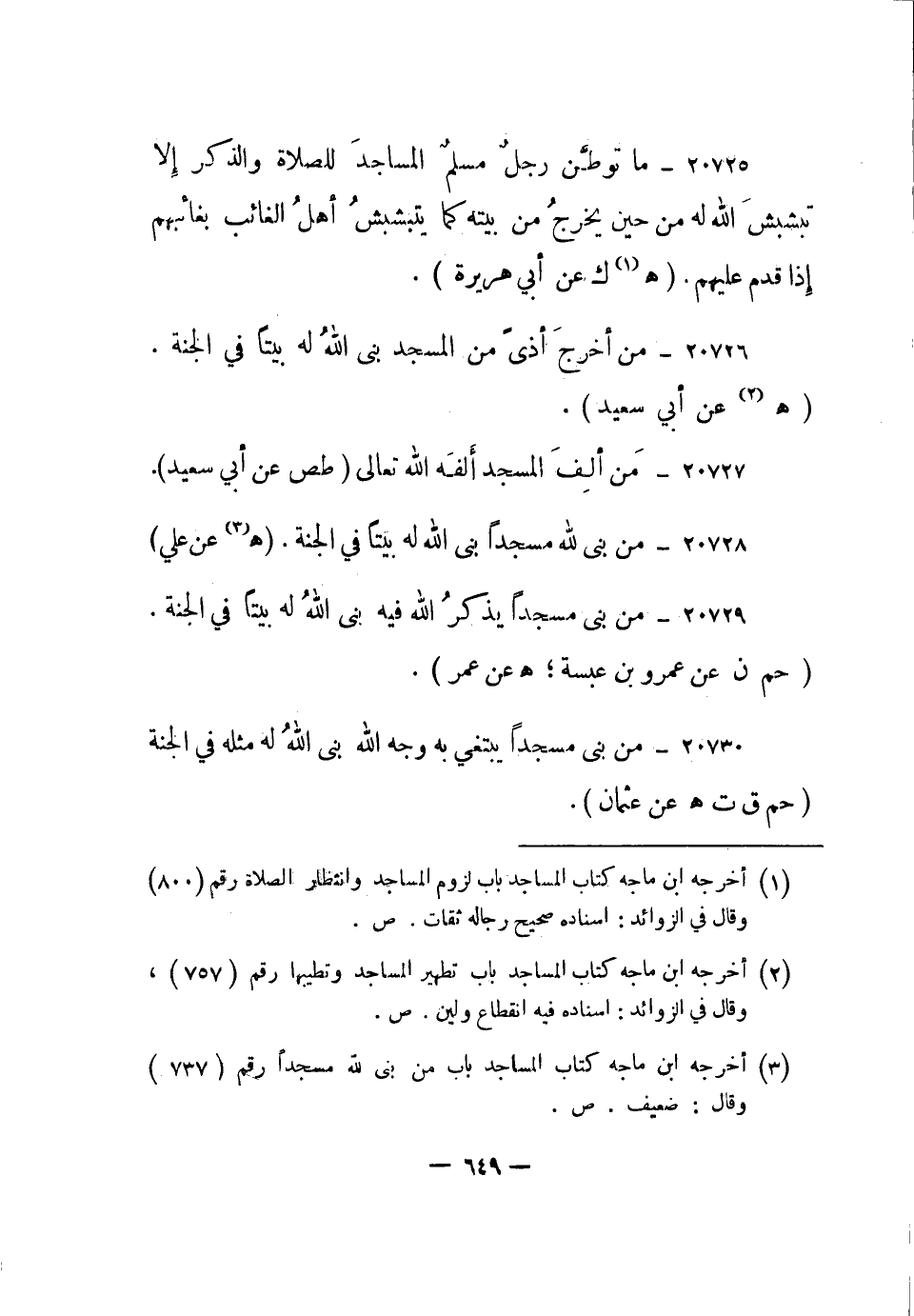 3 أخرجه ابن ماجه كتاب المساجد باب من بنى لله مسجدا رقم "737" وقال: ضعيف. ص